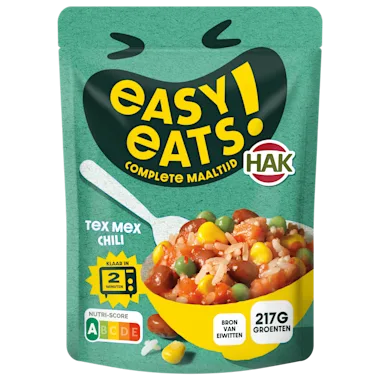 Easy Eats! Tex Mex chili is een complete maaltijd met maar liefst 217 gram groenten. Geniet binnen 2 minuten van deze heerlijke eenpersoonsmaaltijd met zilvervliesrijst, quinoa, tomaat, mais en kidneybonen.