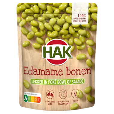 Wat zit er in deze zak: - Edamame bonen - Water - Een snufje zeezout - Verstevigingsmiddel (calciumchloride*). *een zout dat van nature voorkomt in diverse mineralen. Onze missie: Wij willen gezond eten lekker en gemakkelijk maken. Dat doen we volgens de uitgangspunten van de Groene Keuken van HAK. Onze groenten en peulvruchten zitten boordevol vezels, eiwitten en vitamines, en komen daarnaast van zo dichtbij mogelijk. Dat is dus goed voor jou en onze planeet. Nieuwsgierig naar meer hierover? Kijk dan op HAK.nl/groene-keuken. Bonen zij een natuurproduct en kunnen ondanks zorgvuldige schoning nog een steentje bevatten dat van het land is meegekomen. Dit product wordt door middel van hitte in de zak gegaard en houdbaar gemaakt waardoor conserveermiddelen niet nodig zijn.