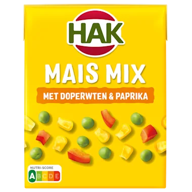 Ingrediënten: Mais 36%, doperwt 21%, rode paprika 8%, water, zout.