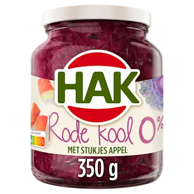 rode kool 65%, appel 24% (appelpuree, appelstukjes 8%), water, appelazijn, kaneel, zwarte peper, natuurlijke aroma.