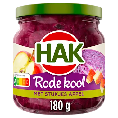rode kool 66%, water, suiker, appelstukjes 6,8%, natuurazijn, maiszetmeel, zeezout.