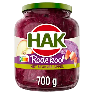 rode kool 66%, water, suiker, appelstukjes 6,8%, natuurazijn, maiszetmeel, zeezout.
