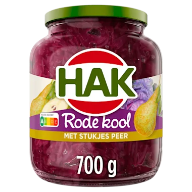 rode kool (66%), water, suiker, stukjes peer 7%, natuurazijn, maiszetmeel, zeezout, kaneel.