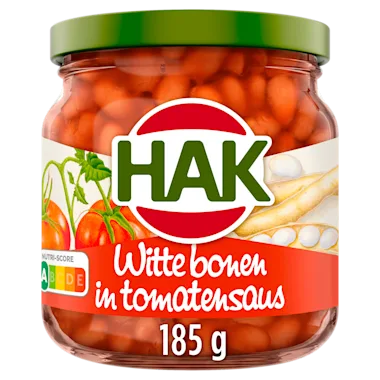 witte bonen 61%, water, tomatenpuree 16%, suiker, zeezout, natuurazijn, maiszetmeel, natuurlijk kruidenaroma.