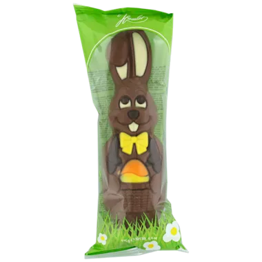 Prachtige chocoladefiguur gemaakt van Belgische melkchocolade en zeer fijn gedecoreerd. Dankzij onze innovatieve productiemethode is de schaal van deze holle figuur overal even dik, hetgeen de breukgevoeligheid aanzienlijk verlaagt. De figuur heeft een grootte van 19.5 cm en is verpakt in een kleurrijk bedrukte toefzak.