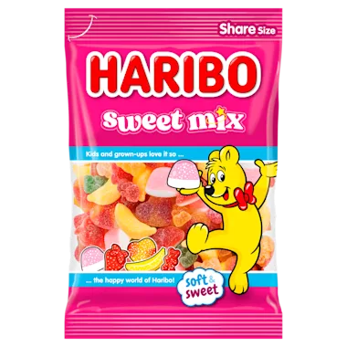 Sweet Mix is een mengelmoes van zachte HARIBO snoepjes. Een verrassend fruitige snoepmix met citroen, kers, sinaasappel, appel en ananas.