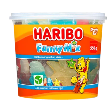 Het plezier is groot met Funny Mix. Want deze mix voor een goed humeur is een bonte verzameling van de grappigste HARIBO snoepjes – allemaal extra groot en extra lekker.