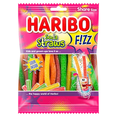 Super lekker zijn ze, die Soda Staws F!ZZ van HARIBO. De één nog gekker dan de ander; deze zure snoep-staafjes smaken naar meer! In de smaken: cola, tropische passievrucht, aardbei en perzik ijsthee.