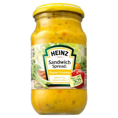 Heinz Sandwich Spread Pikante Groenten is een lekkere lichte spread. De combinatie van knapperige stukjes groenten maakt deze spread fris van smaak. Een verrassende variatie op de boterham. Lekker fris, lekker anders!