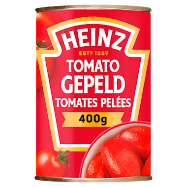 Heinz Tomato Gepeld is gemaakt van goede kwaliteit zongerijpte tomaten voor een onweerstaanbare, volle smaak. De sappige tomaten zijn binnen 48 uur na de oogst verpakt om de rijke verse smaak te garanderen. Heinz tomato gepeld is lekker door diverse gerechten zoals in een pasta of wraps.