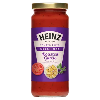 Heinz Tomato Frito Creations, een verrijkte tomatensaus voor al jouw pasta's, ovenschotels, pizza's en meer. Smaakt heerlijk en is binnen 20 minuten klaar! Nadat we de verse knoflook en uien 2 uur langzaam hebben laten sudderen in extra vierge olijfolie, hebben we dit geblend met onze 100% zongerijpte tomaten, geroosterd knoflookextract en mediterrane kruiden.