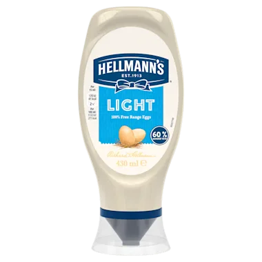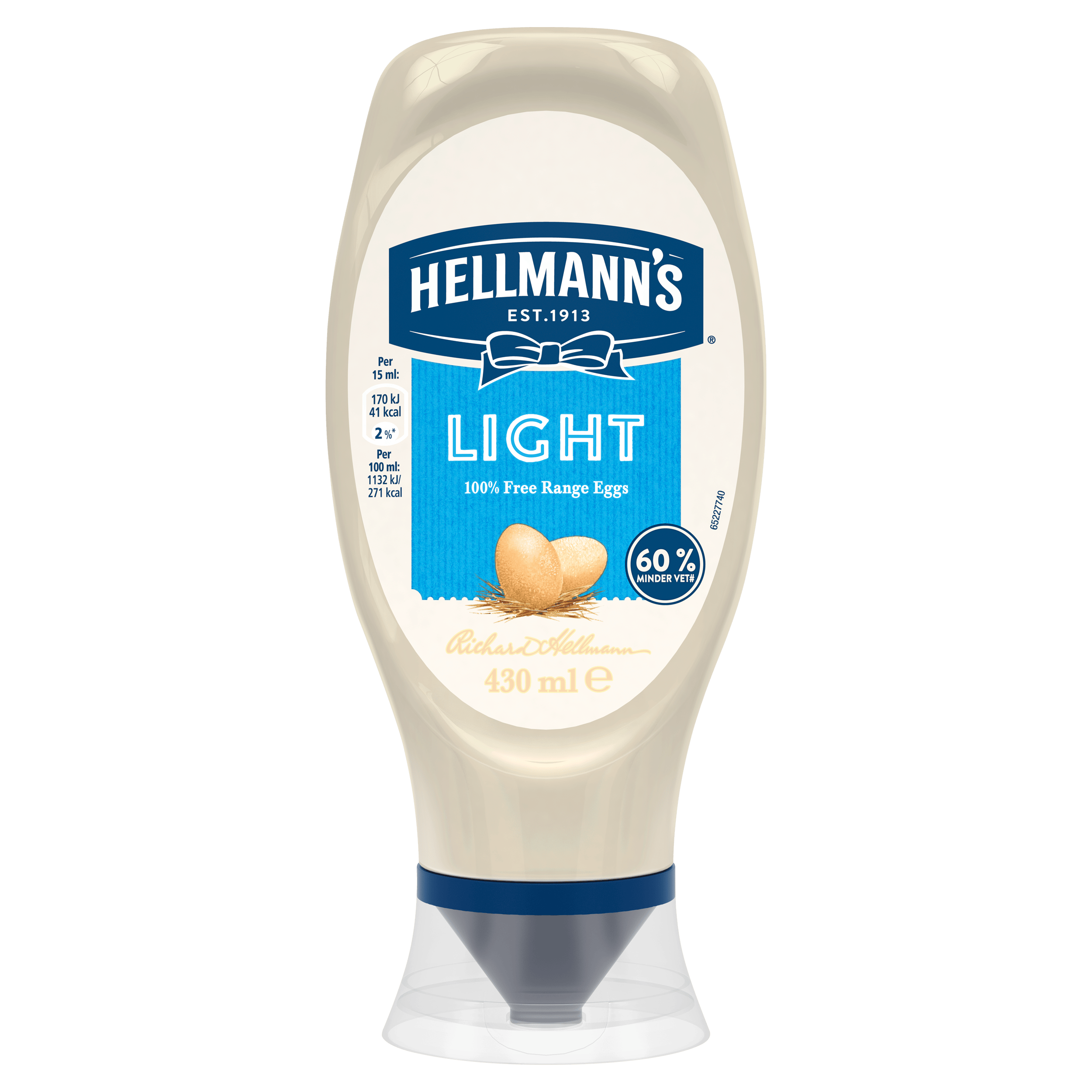 Hellmann's Light Mayonaise Knijpfles is romig en geschikt voor vegetariërs Gemaakt van pure ingrediënten en bereid met vrije-uitloopeieren Deze saus van Hellmann's bevat 60% minder vet dan mayonaise Lekker bij jouw hamburger, salade en sandwich of bij het gourmetten De Light is verpakt in een handige knijpfles met schone dop Hellmann's geeft om smaak en gebruikt ingrediënten van hoge kwaliteit