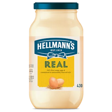 Ervaar de unieke smaak van Hellmann's Real Mayonaise, gemaakt volgens authentiek Engels recept. Hellmann's Real heeft een onmiskenbare frisse smaak en een stevige structuur, een heerlijke saus die uitermate geschikt is voor de echte liefhebber. Hellmann's Real Mayonaise is verkrijgbaar in glazen potten van verschillende formaten en ook in een handige knijpfles.