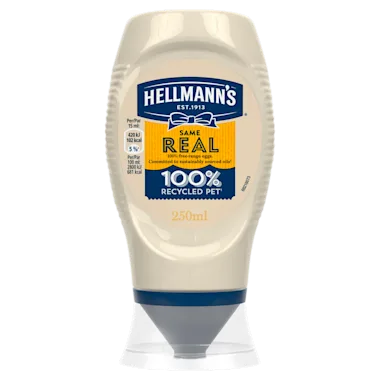 Ervaar de unieke smaak van Hellmann's Real Mayonaise, gemaakt volgens authentiek Engels recept. Hellmann's Real heeft een onmiskenbare frisse smaak en een stevige structuur, een heerlijke saus die uitermate geschikt is voor de echte liefhebber. Gemaakt van pure ingrediënten en bereid met 100% vrije-uitloopeieren. Deze mayonaise is het gouden ingrediënt voor jouw hamburger, salade of sandwich.
