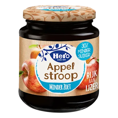 Een boterham met (15 gram) Hero Appelstroop bevat 20% van de referentie-inname van ijzer**. * 30% minder suiker.