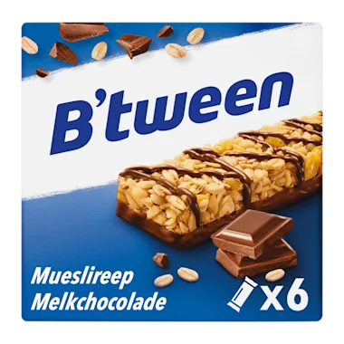 Een heerlijke B'tween mueslireep met melkchocolade en granen, zoals haver, tarwe en gerst. De ideale granenreep als tussendoortje, zonder conserveermiddelen of kunstmatige kleurstoffen.