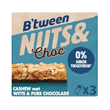 Ontdek de nieuwe B'tween Nuts & Choc Cashew! Ruim 45% noten en pinda's aangevuld met romige witte en pure chocolade voor een unieke smaakbeleving. Geniet van dit tussendoortje waar je ook bent!