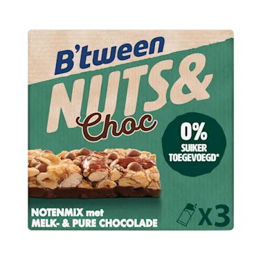 Maak kennis met B'tween Nuts & Choc gemixte noten! Een reep met meer dan 45% noten en pinda's met de rijke smaak van melk en pure chocolade. Rijk aan vezels en zonder toegevoegde suikers, proef 'm nu!