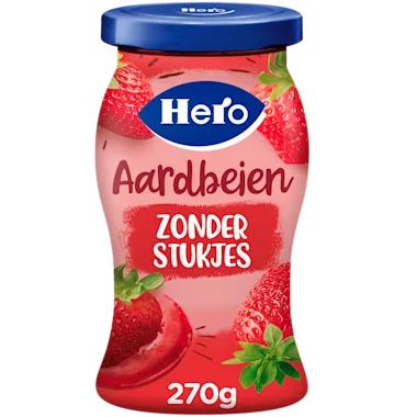 Hero Aardbeien Zonder stukjes is een heerlijke, zachte Hero fruitspread zonder stukjes of pitjes. Deze marmelade is heerlijk op je boterham, beschuit of cracker en is het perfecte zoete broodbeleg!