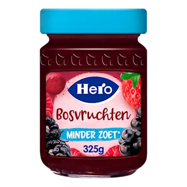 Deze fruitspread is net zo lekker als gewone jam, maar bevat minder suiker. Hero Minder Zoet Bosvruchten is gemaakt van extra veel bosvruchten en smaakt fruitig en natuurlijk. Verantwoord genieten doe je met deze vruchtenspread.