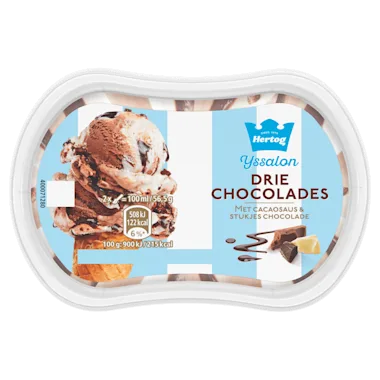 De Hertog Drie Chocolades Mini IJssalon ijsbak is één van onze ijsspecialiteiten. Bij Hertog zijn we liefhebbers van heel goede chocolade en gebruiken de allerbeste chocolade, gemaakt met geduld en Belgisch vakmanschap. Deze Drie Chocolades Mini IJssalon is samengesteld uit heerlijk roomijs van witte chocolade, gespateld met melkchocolade roomijs met pure chocoladesaus. Voeg daar nog de knapperige chocolade chunks aan toe en voilà, een heerlijke traktatie voor de echte chocoladeliefhebbers.