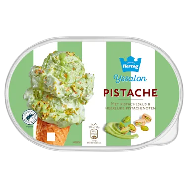 Laat je verrassen door Hertog IJssalon Pistache IJs, een combinatie van pistache-ijs en vanille-ijs, overgoten met pistachesaus en geroosterde stukjes pistachenoot. Al sinds 1976 geniet Nederland van het heerlijke, romige ijs van Hertog. Met passie gecreëerd door onze ervaren ijsmeesters en bereid met zorgvuldig geselecteerde ingrediënten zonder kunstmatige kleur- en smaakstoffen en met Rain Forest Alliance-gecertificeerde vanille. Bekroon je dag met een ijsje van Hertog IJssalon, heerlijk als nagerecht of gewoon voor tussendoor om alleen, of samen, van te genieten.