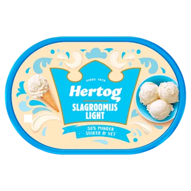 Tot op de dag van vandaag staat Hertog IJs voor heerlijk roomijs, bereid met de lekkerste ingrediënten. Met aandacht samengesteld om samen van te genieten. Hertog heeft verschillende smaken die je doen watertanden bij de gedachte, en ook nog eens voor iedereen! Of je op zoek bent naar een simpele basis voor jouw toetje, of een toetje waar je helemaal niks meer aan hoeft te doen. Ook kan je met Hertog ijs een heerlijk dessert maken voor de feestdagen. Met Hertog IJs creëer je overal en op elk moment een heus spektakel. Zo ook met de bijzondere smaak Hertog Slagroomijs Light. Heerlijk zacht en romig luxueus ijs, bereid met verse magere melk en slagroom. Deze smaaksensatie is daarom ook echt een ijsspecialiteit onder het ijs, die de liefhebbers van slagroomijs zeker niet kunnen laten staan. Heerlijk om samen van te genieten met vrienden of familie. Benieuwd naar de andere smaken van Hertog IJs? Kijk op Hertogijs.nl voor al onze andere smaken en heerlijke recepten. Hertog Slagroomijs Light is met passie gecreëerd en bereid met zorgvuldig geselecteerde ingrediënten, zonder kunstmatige kleur- en smaakstoffen. Heerlijk in een bakje of op een hoorntje en lekker om samen van te genieten. Hertog met hartstocht bereid.