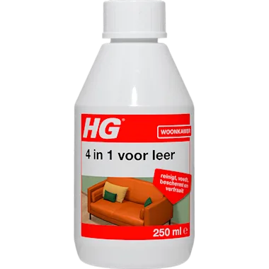 HG 4 in 1 voor leer reinigt en voedt het leer, waardoor het soepel blijft en perfect beschermd wordt tegen vuil, vlekken en transpiratievocht. HG 4 in 1 voor leer is gemaakt op waterbasis en verzorgt zogenaamde vol-aniline en gedekverfde leersoorten zoals bij meubelen, koffers en tassen. Ook verdiept het de kleur en structuur van het leer, waardoor het er weer als nieuw uitziet. Na de behandeling hecht het vuil zich niet meer aan het leer en wordt bovendien uitdroging van het leer voorkomen.