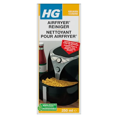 HG airfryer® reiniger is een unieke, gepatenteerde en uiterst krachtige reiniger voor airfryers. Hard voor de aanslag maar veilig voor de airfryer. Door het gebruik ontstaat in airfryers een hardnekkige aanslag van aangekoekt vet en voedselresten. Deze aanslag is zelfs met het allerbeste afwasmiddel, speciale ontvetters of in de vaatwasser niet te verwijderen. HG airfryer® reiniger lost deze aanslag eenvoudig op. Goed voor ongeveer 5 schoonmaakbeurten.