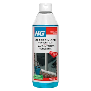 HG glasreiniger concentraat is super geconcentreerd en reinigt absoluut streeploos. Het product reinigt de ramen intensief en ontvet, zonder dat het ammonia en spiritus bevat.  HG glasreiniger concentraat wordt niet voor niets door professionele glazenwassers gebruikt. Het voldoet aan alle professionele eisen en zelfs meer, want het is pH-neutraal en tast verf, lak en kunststof dus niet aan en is mild is voor de handen. Het is zeer zuinig in gebruik; een fles is goed voor tenminste 35 wasbeurten.