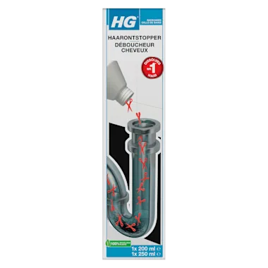 HG haarontstopper lost verstoppingen op in de badkamerafvoer door haren, zeepresten, huidvetten en tandpasta. Het is geschikt voor de doucheput, wasbak of ligbad. In de badkamer zijn haren dé veroorzaker van verstoppingen van zowel wasbak, douche als bad. Dit wordt nog eens verergerd door zeepresten, huidvetten en tandpasta die de haren vasthouden. HG haar ontstopper is versterkt met kaliumhydroxide en lost haren snel, effectief en volledig op, alsook alle materialen die ze tegenhouden.