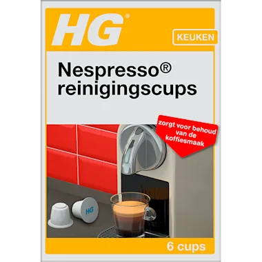 HG Nespresso® reinigingscups zijn speciaal ontwikkeld om de cuphouder van Nespresso machines te reinigen van aanslag. Hierdoor blijft de koffie lekker smaken en gaat het apparaat langer mee. Het met druk zetten van koffie zorgt voor aanslag van koffie en koffievet in de cuphouder en in het uitstroompijpje. Dit heeft een nadelig effect op de smaak en wordt erger naarmate de aanslag langer blijft zitten en verder ophoopt. HG Nespresso® reinigingscups rekenen snel en veilig af met deze aanslag.