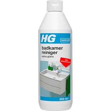 HG badkamerreiniger extra glans laat wastafels, badkuipen, toiletpotten, kranen en tegels weer glanzen. Het ruikt fris en verwijdert badolieranden, zeepresten, huidvetten en lichte kalkaanslag. HG badkamerreiniger extra glans bevat geen schuurmiddelen of agressieve bestanddelen en is dus veilig voor glazuur, chroom, email, kunststof of geverfde oppervlakken. Het streept niet en voorkomt bij regelmatig gebruik kalkaanslag. Door de hoge concentratie zijn een paar druppels op een spons voldoende.
