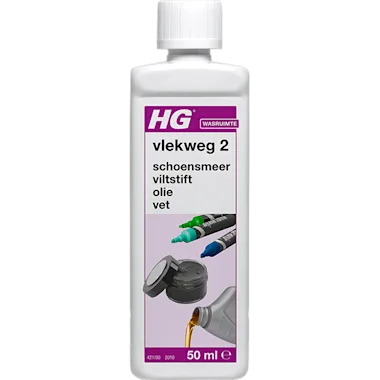 HG vlekweg 2 verwijdert vlekken uit textiel van: viltstift, vet, olie, schoensmeer, maar ook spijsolie, frituurvet, smeer, stickers en tippex.