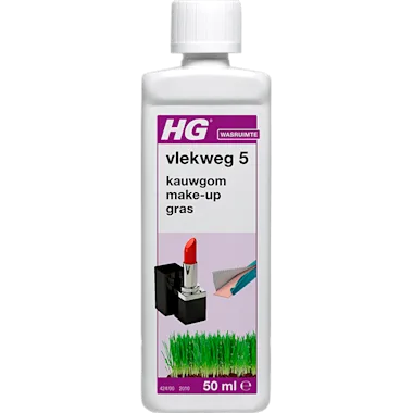 HG vlekweg 5 verwijdert vlekken uit textiel van: make up, gras, stuifmeel, markeerstift, kauwgom maar ook mascara, waterverf, aarde, klei, bouwzand en gravel.