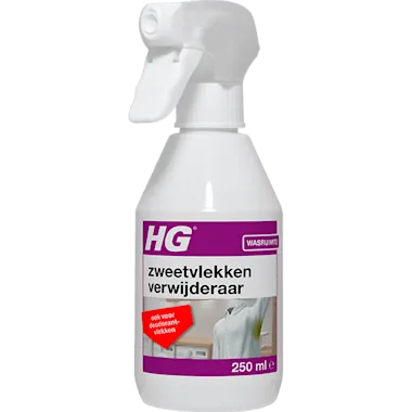 HG zweetvlekken verwijderaar verwijdert de gele zweet- en deodorantvlekken uit textiel. Het helpt ook om zweetvlekken in kleding te voorkomen. HG zweetvlekkenverwijderaar is dé effectieve voorbehandeling voor het verwijderen van gele vlekken uit textiel door zweet of deodorant. Gewone wasmiddelen of vlekverwijderaars verwijderen deze vlekken niet. Geschikt voor zowel wit als gekleurd textiel en om tijdens elke wasbeurt te gebruiken om gele vlekken te voorkomen.