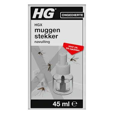 HGX muggenstekker verspreidt continu een reukloze damp die in de lucht blijft hangen, waardoor muggen worden gedood. Muggen zijn vooral ’s avonds en ’s nachts actief en veroorzaken veel hinder. HGX muggenstekker is een effectief middel tegen muggen op de slaapkamer. De continue reukloze damp die wordt verspreidt, elimineert niet alleen de reeds aanwezige muggen, maar ook muggen die naar binnen vliegen. De navullimng is genoeg voor 54 nachten.
