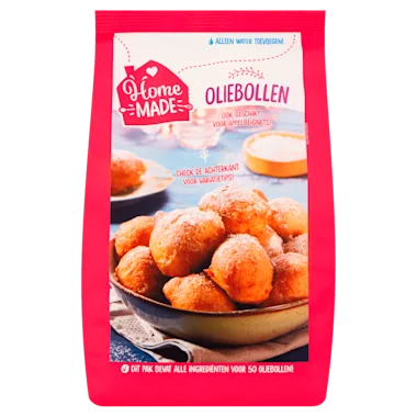 Ingrediënten: oliebollenmix: TARWEbloem, maïszetmeel, weipoeder [MELK], suiker, zout, gedroogde bakkersgist, TARWEmoutmeel, meelverbeteraars (E300, enzymen (TARWE)). Kan andere glutenbevattende granen en ei bevatten.