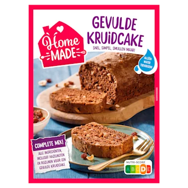 Ingrediënten: Kruidcakemix 400 g (83,3%): suiker, TARWEbloem, ROGGEbloem, SOJAbloem, rijsmiddelen (E500,E450), specerijen, TARWEzetmeel, geroosterd TARWEmoutmeel, kleurstof (E150a), emulgatoren (zonnebloemlecithine, E482), zout, verdikkingsmiddelen (E412, E415), TARWEmoutmeel, enzymen (TARWE), voedingszuur (E300), ROGGEmoutmeel. Rozijnen 50 g (10,4%): rozijnen. Hazelnoten 30 g (6,3%): HAZELNOTEN. Gemaakt in een fabriek waar ook EI en MELK wordt verwerkt.