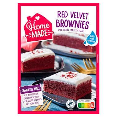 Ingrediënten: Red Velvet Brownie mix 275 g (77,5%): suiker, TARWEbloem, palmolie, cacaopoeder¹ (7,6%), gedroogde glucosestroop, kleurstoffen (E162,E120), magere MELKpoeder, scharrelei-EIwitpoeder, MELKeiwit, zout, stabilisator (E451), aroma, natuurlijk aroma. Royal icing mix 80 g (22,5%): suiker, gedroogde glucosestroop, scharrelei-EIwitpoeder. ¹ Rainforest Alliance Certified.