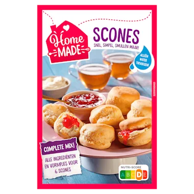 Ingrediënten: Sconesmix: TARWEbloem, suiker, palmolie, gemodiceerd aardappelzetmeel, yoghurtpoeder (MELK), rijsmiddelen (E450,E500), scharrelei-EIgeelpoeder, verdikkingsmiddel (E464), glucosestroop, aroma, zout, MELKeiwit, dextrose. Afkomstig uit een fabriek waar ook SOJA wordt verwerkt.