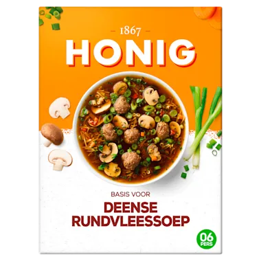 Honig Deense Rundvleessoep is een heldere bouillon, gevuld met vermicelil en soepgroenten en is op smaak gebracht me tuinkruiden. Door het toevoegen van verse ingrediënten, zoals rundersoepballetjes en kastanja champignons, zet je snel en makkelijk een heerlijke, zelfgemaakte soep op tafel! Deze soepbasis is goed voor 6 personen en staat binnen 10 minuten al op tafel. Snel en gemakkelijk te bereiden met de vertrouwde smaak van Honig. Bereid de Deense Rundvleessoep zoals de algemene bereidingswijze of vervang de rundersoepballetjes, champignons en lente-ui met 150g gesneden runderrepjes, 200g wortel en een bosje fijngesneden selderij. Dus aan tafel met Honig!
