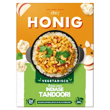 3 Voeg 100 ml water en Honig basis voor Indiase Tandoori toe. Breng het geheel al roerend aan de kook. Laat de saus onder af en toe roeren ca. 1 minuut zachtjes doorkoken. Voeg vervolgens de in stukjes gesneden appel toe