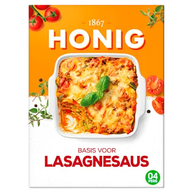 Honig basis voor Lasagnesaus is een mix met Italiaanse kruiden en specerijen. Door het toevoegen van verse ingrediënten, zoals groenten en vlees, zet je snel en makkelijk een heerlijke lasagne op tafel. Deze mix is goed voor een maaltijd voor 4 personen en de lasagne staat na zo'n 45 minuten op tafel, inclusief oventijd. Kook zoals de algemene bereidingswijze of kook zonder rundergehakt voor een dagje zonder vlees. Vergeet niet om je eigen draai eraan te geven! Dus aan tafel met Honig!