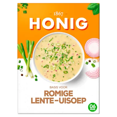Honig Romige Lente-uisoep is een zachtromige soep van frisse lente-uitjes. De lente-uitjes en de licht Provençaalse kruiding geven je zelfgemaakte soep een verrassende smaak. Deze portie voor 6 personen staat al binnen 20 minuten klaar! Het enige wat je zelf toe hoeft te voegen is 3 grote lente-uitjes en 1 moddelgrote, rode ui. Varieer met je favoriete groenten!