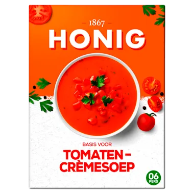 Honig Tomaten-Cremesoep is een lichtgebonden tomatensoep met een zachte, romige karakter. Door het toevoegen van verse ingrediënten, zoals tomaten en peterselie, zet je snel en makkelijk een heerlijke, zelfgemaakte soep op tafel! Deze soepbasis is goed voor 6 personen en staat binnen 10 minuten al op tafel. Snel en gemakkelijk te bereiden met de vertrouwde smaak van Honig. Bereid de Tomaten-Cremesoep zoals de algemene bereidingswijze of voeg fijngesneden bosuitjes toe om te variëren. Dus aan tafel met Honig!