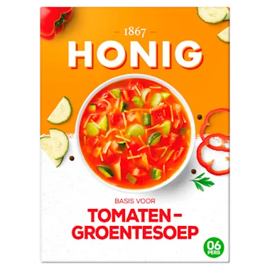 Honig Tomaten-Groentesoep is een heerlijke, lichtgebonden tomatensoep gevuld met fijne groenten en vermicelli. Door het toevoegen van verse ingrediënten, zoals Italiaanse roerbakgroenten en tomaten, zet je snel en makkelijk een heerlijke, zelfgemaakte soep op tafel. Deze soepbasis is goed voor 6 personen en staat binnen 10 minuten al op tafel. Snel en gemakkelijk te bereiden met de vertrouwde smaak van Honig. Bereid de Tomaten-Groentesoep zoals de algemene bereidingswijze of voeg 1 à 2 theel. Ras el hanout kruiden toe om te variëren. Dus aan tafel met Honig! - Tomaten-groentesoep voor 6 personen - Bereidingstijd: 10 minuten - Zelf toevoegen: 200g Italiaanse roerbakgroenten, 1 middelgrote tomaat, 1500ml water - Varieer door de roerbakgroenten bij stap 2 door 200g Marokkaanse/Provencaalse workgroenten te vervangen. Voeg voor een extra twist 1 à 2 theel. ras el hanout kruiden toe aan de soep! - Bezoek onze website www.honig.nl voor meer inspiratie Iedereen verdient het om dagelijks van een warme maaltijd te genieten. Daarom helpt Honig al meer dan 150 jaar om samen aan tafel te gaan voor een smaakvolle, warme maaltijd!