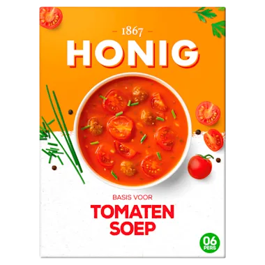 Honig Tomatensoep is een lichtgebonden tomatensoep met de volle smaak van tomaten. Door het toevoegen van verse ingrediënten, zoals rundersoepballetjes en cherrytomaatjes, zet je snel en makkelijk een heerlijke, zelfgemaakte soep op tafel! Deze soepbasis is goed voor 6 personen en staat binnen 10 minuten al op tafel. Snel en gemakkelijk te bereiden met de vertrouwde smaak van Honig. Bereid de Tomatensoep zoals de algemene bereidingswijze of voeg extra gesneden rode paprika toe om te variëren. Dus aan tafel met Honig!