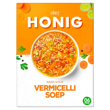 Honig Vermicellisoep is een heldere soep, rijkgevuld met vermicelli, fijne groenten en tuinkruiden. Door het toevoegen van verse ingrediënten maak je zo een heerlijke, zelfgemaakte soep. Deze portie voor 6 personen staat al binnen 20 minuten klaar! Het enige wat je zelf toe hoeft te voegen is 150g rundersoepballetjes, 125g wortel, 3 grote lente-uitjes. Varieer met je favoriete groenten!