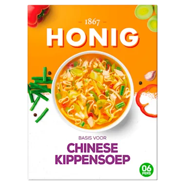 Honig Chinese Kippensoep is een heerlijke, geurige kippensoep met groenten, mie-reepjes en een licht oosterse kruiding. Door het toevoegen van verse ingrediënten maak je zo een heerlijke, zelfgemaakte soep.